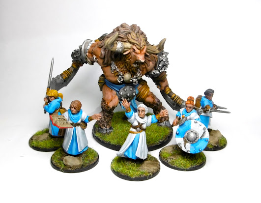 On commence par le med-fan générique et une "bande" de quelques magiciennes / guerrières accompagnées d'un minotaure pour la force de frappe. Les dames sont issues de la boîte de magiciennes de chez Northstar pour Frostgrave, complétées de quelques bitz piochés dans la boîte à rabiots. Le mino est une ilmpression 3D, marque inconnue de votre serviteur). Cette joyeuse troupaille a été peinte en deux séances (soit environ six heures) et sera offerte à l'ami Gilel en remerciement pour ses nombreuses impressions. Il pourra s'en servir pour tester Sol Braynïa par exemple.